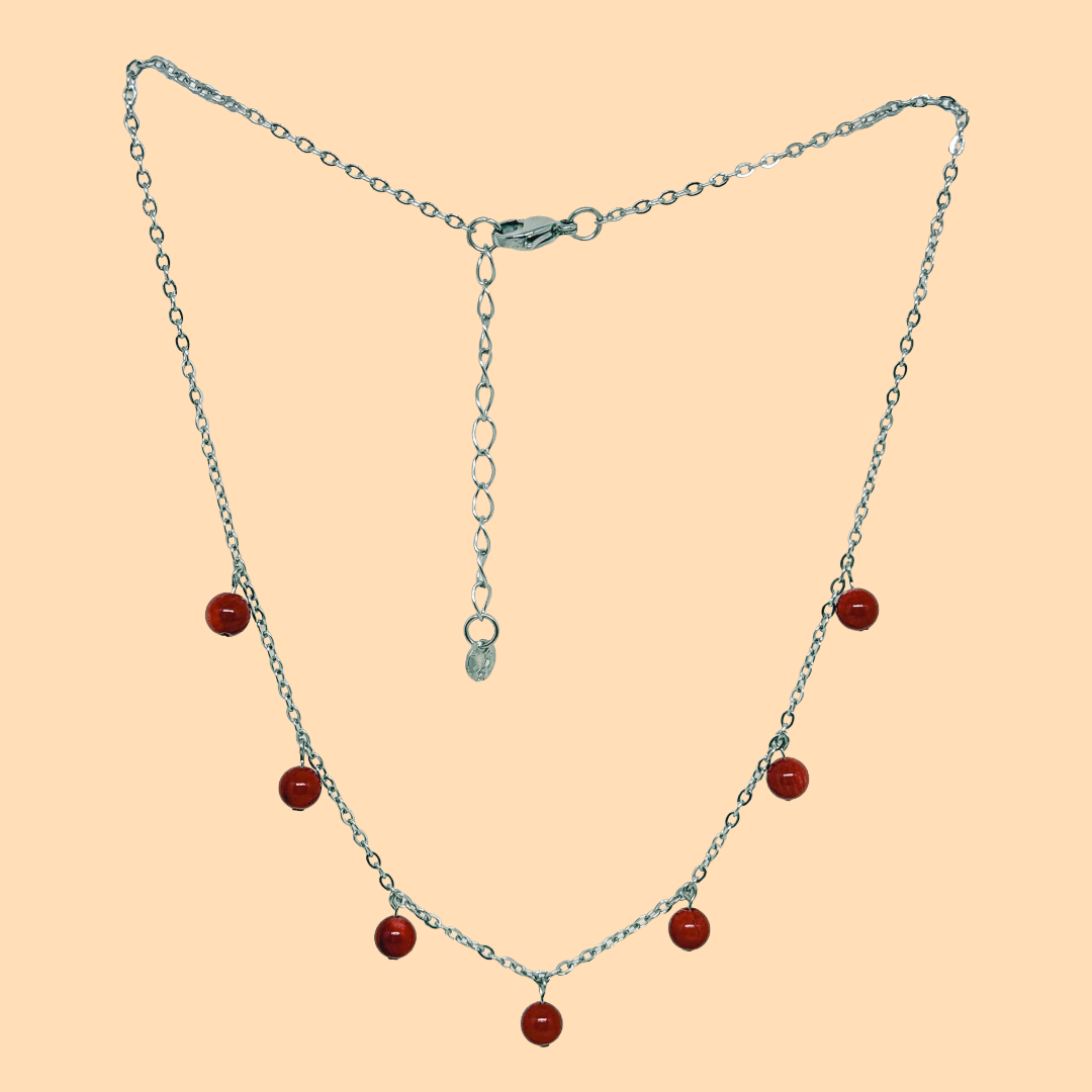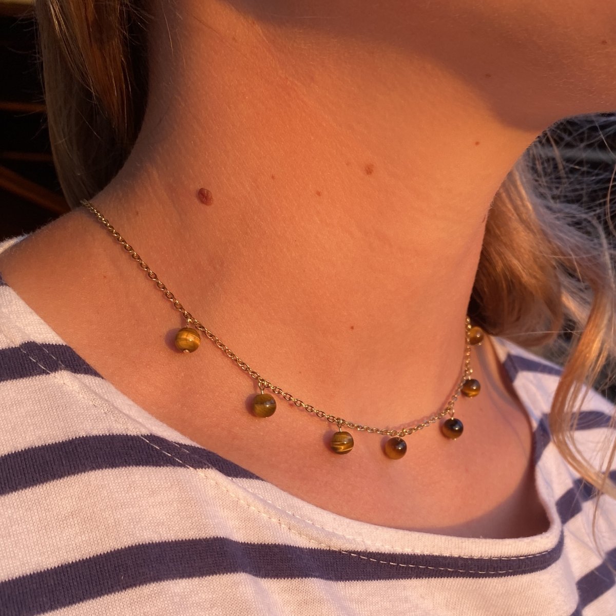 Le collier été est composé de 7 perles de 6mm de diamètre, pendants à la chaînette. D'une longueur minimum de 40cm, il est réglable et s'adapte ainsi à toutes tes tenues ! 🌸