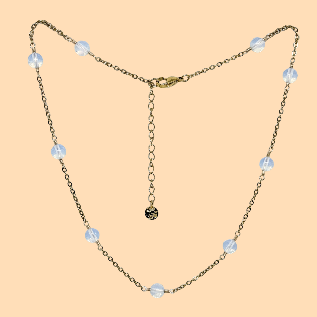 Le collier printemps est composé de 9 perles de 6mm de diamètre, liés par des chaînettes. D'une longueur minimum de 40cm, il est réglable et s'adapte ainsi à toutes tes tenues ! 🌸